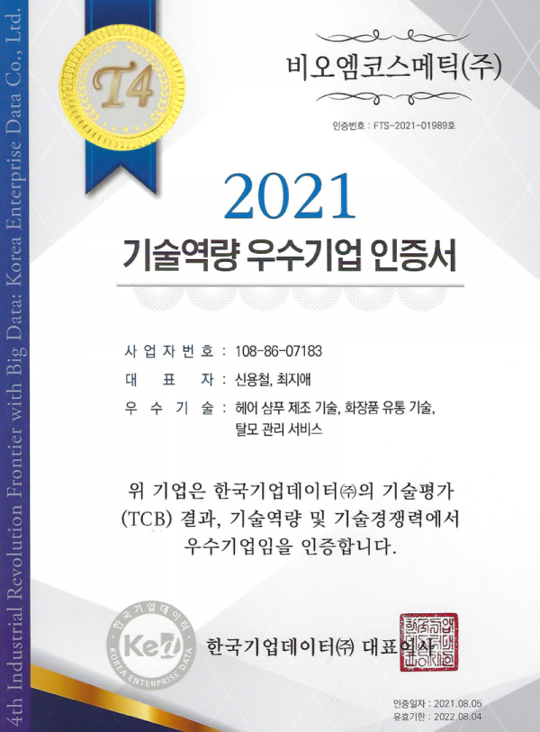 헤어 샴푸 제조기술, 화장품 유통 기술, 탈모 관리 서비스 부분을 인정받아 기술평가 T4 인증서를 획득 했습니다.