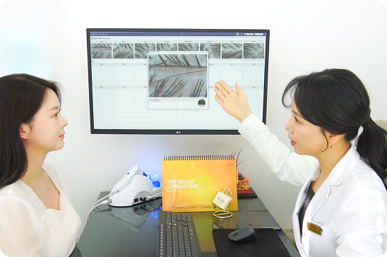 고배율 현미경을 통해 전체적인 두피 컨디션과 증상의 단계를 확인 및 체크를 진행 하며 두피 진단을 통해